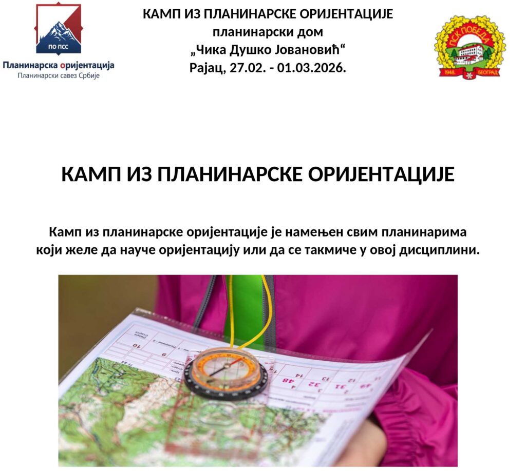 Камп из планинарске оријентације је намењен свим планинарима који желе да науче оријентацију или да се такмиче у овој дисциплини. Број учесника: Ограничен, по редоследу пријављивања и уплати котизације Начин пријаве: Слањем пријаве на e-mail: v.matkovic@itnms.ac.rs најкасније до 24.02.2026. Пријава је важећа уз комплетне податке полазника и уплату котизације. Приликом пријаве послати следеће податке: Цена