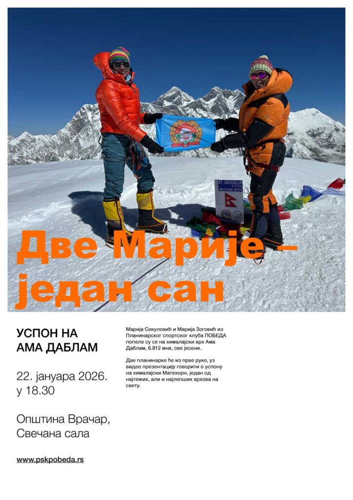 Том приликом ће наше чланице, Марија Секуловић и Марија Зоговић, говорити о свом недавном искуству успона на планину Ама Даблам и поделити утиске са ове изузетне алпинистичке експедиције.